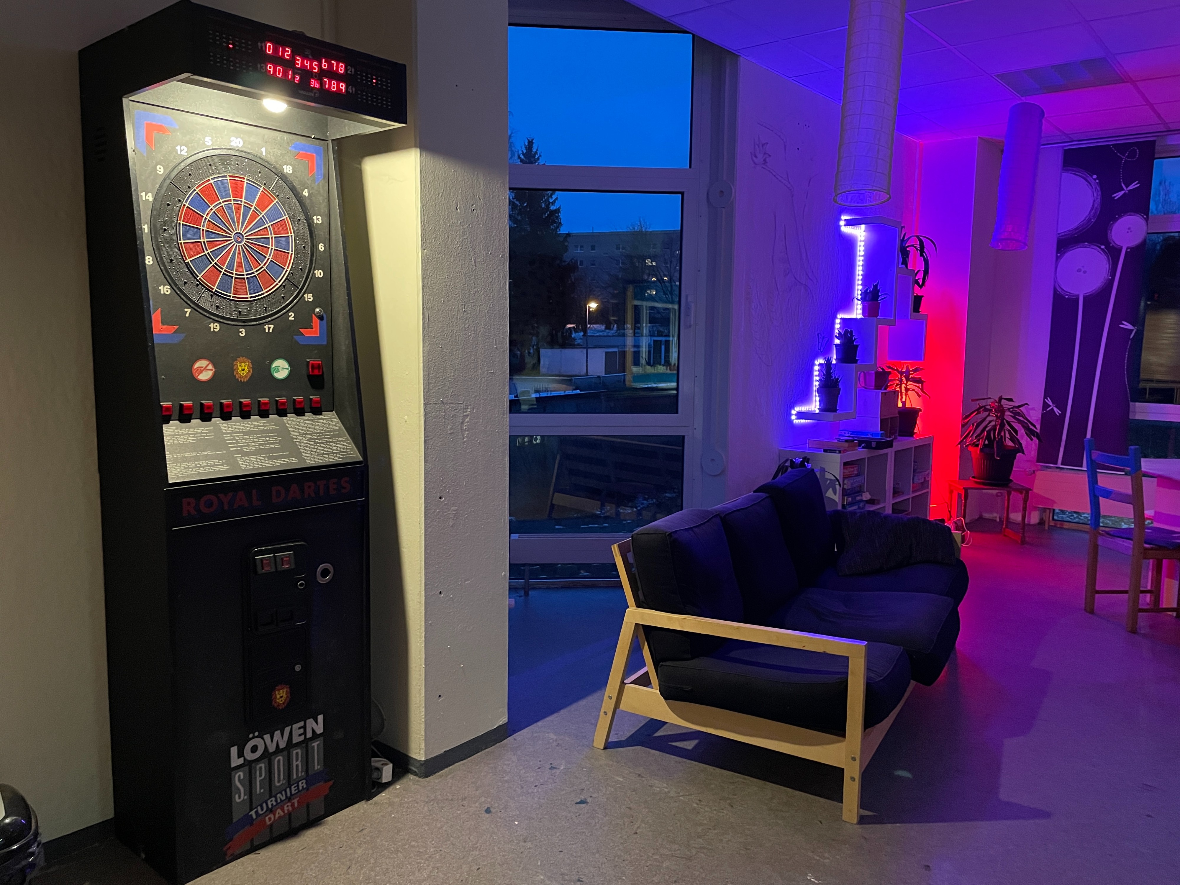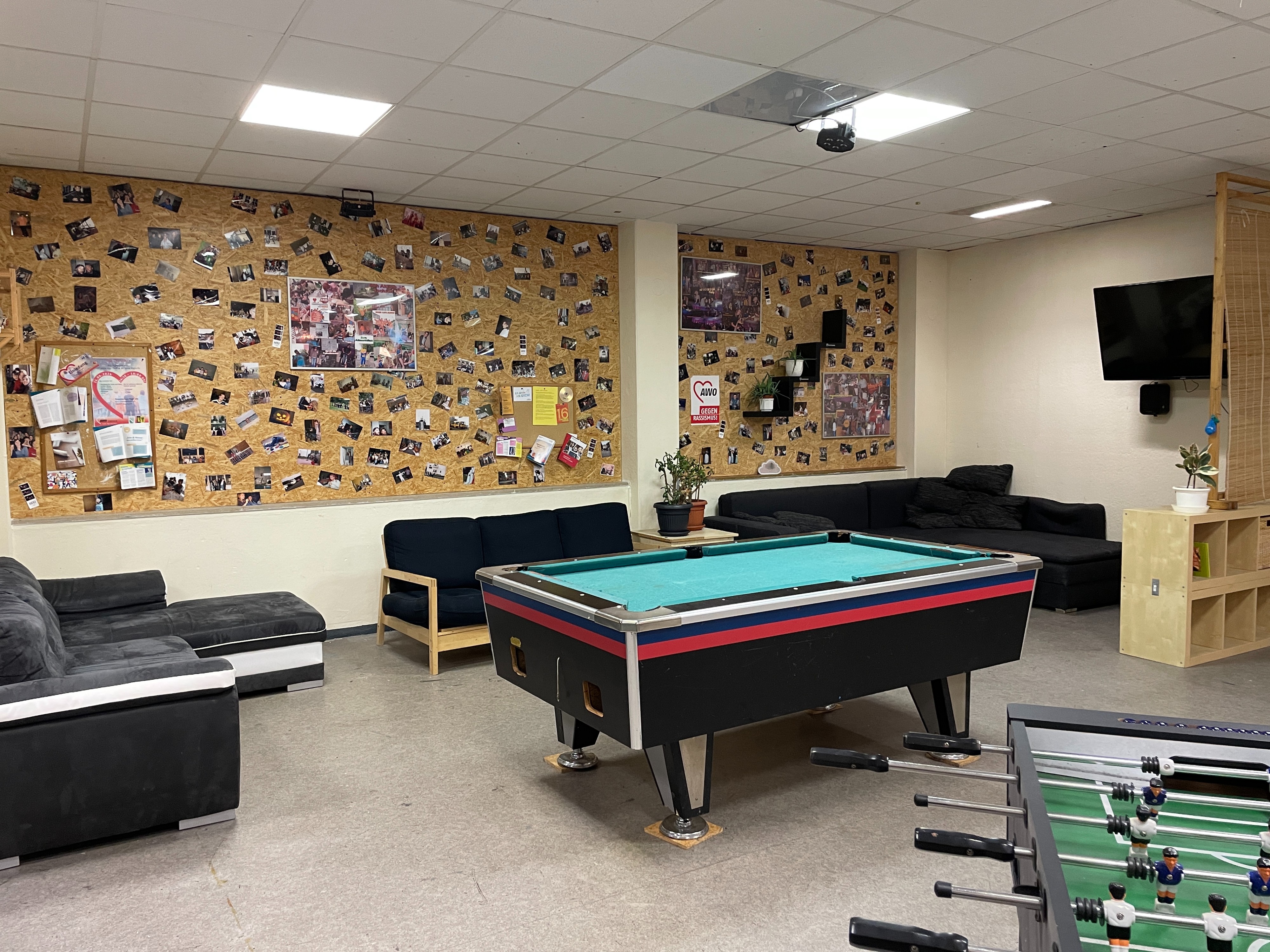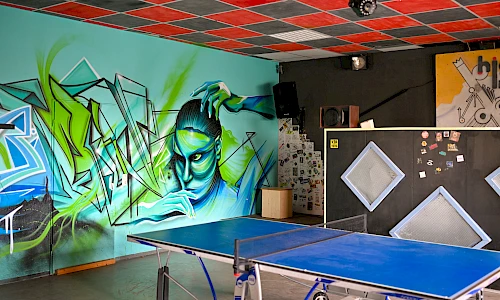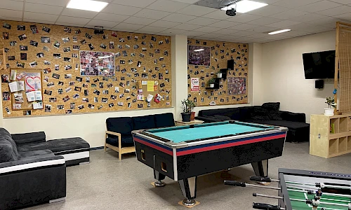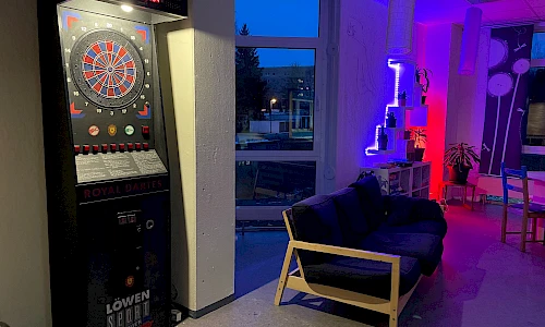 Offener Bereich mit Tischtennis, Dart, Tischkicker und Billard